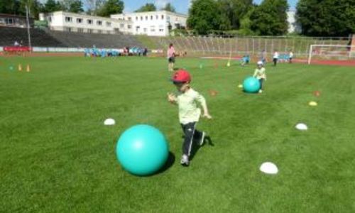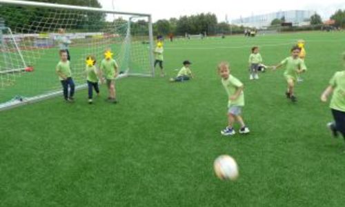Das alljährliche Sportfest im HW-Leasing Stadion steht ganz im Zeichen des Fußballs. Die Kinder konnten zeigen, was sie beim Dribbeln um Slalomstangen und beim Toreschießen schon können. Ein großes Fußballturnier, bei dem alle Mannschaften gegeneinander spielten, bildete den Abschluss dieses Vormittags.