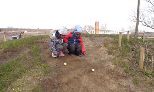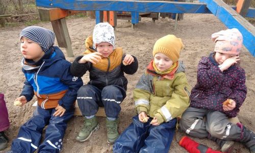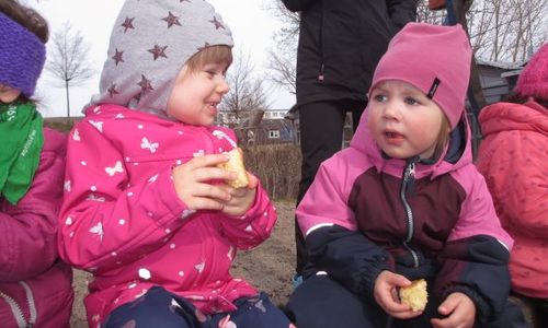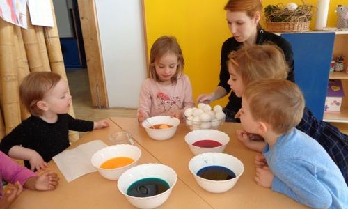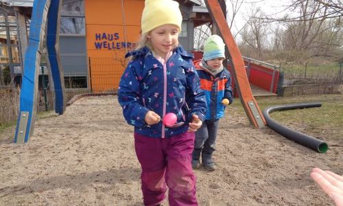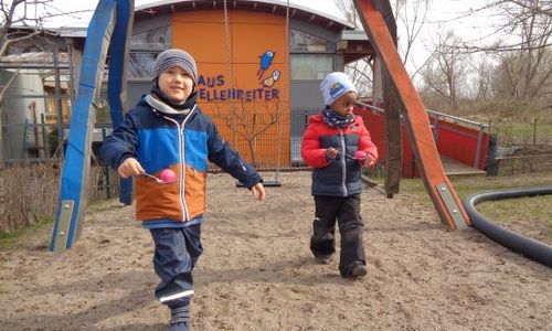 Zur Osterzeit haben die Kinder viel erlebt, zum Beispiel: Eiertrudeln, Eierlaufen,Osterfeuer und Osterbrot brechen.